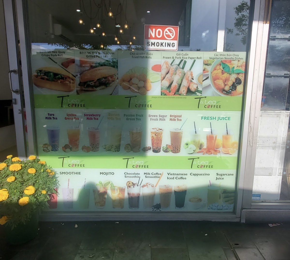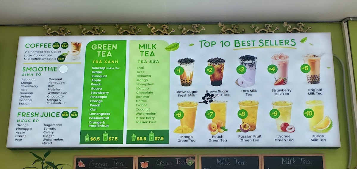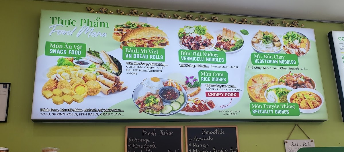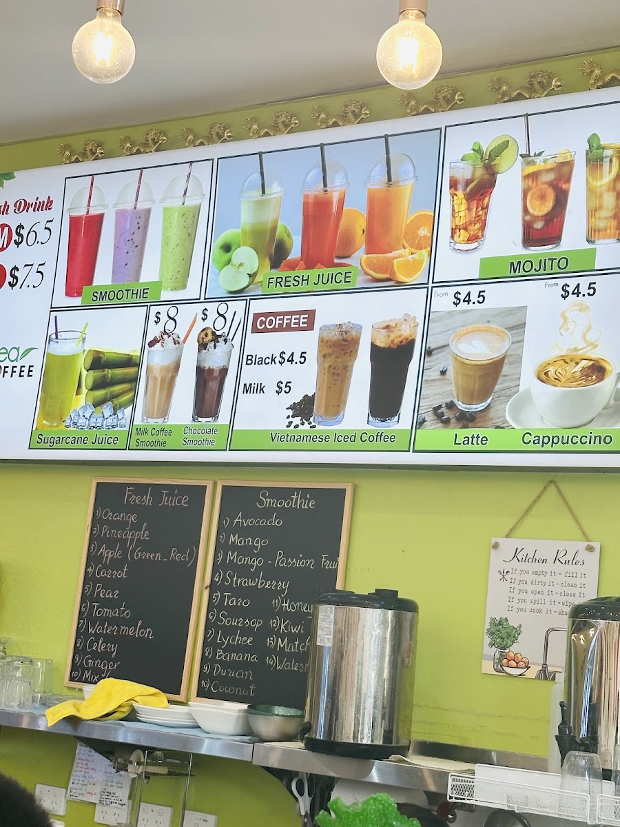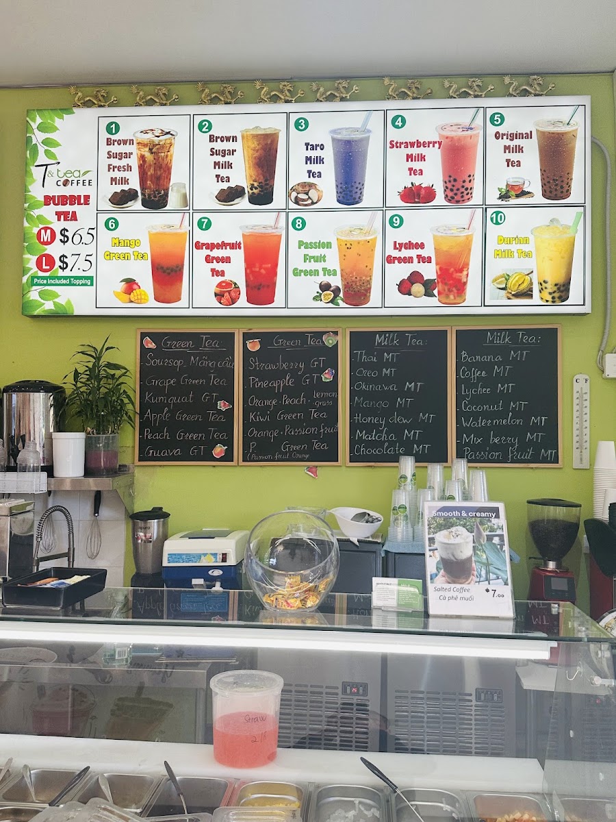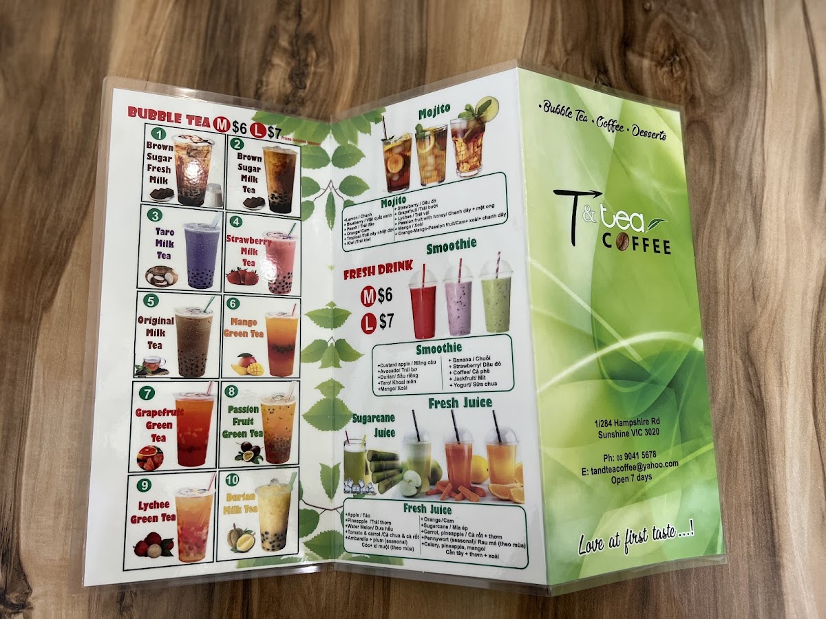 The menu at T & Tea Coffee offers a delightful mix of traditional Vietnamese dishes and refreshing beverages. For savory options, the Grilled Pork And Spring Roll On Rice Vermicelli and the Sugar Cane Shrimp And Grilled Beef Wrap In Betel Leaf On Rice Vermicelli stand out as flavorful favorites. There's also the Bún Chạo Tôm Và Bò Lá Lốt and Canh Bún Cua Đồng, both offering a taste of authentic Vietnamese cuisine. The Crispy Pork Belly Bánh Mì is perfect for those craving a crispy, savory sandwich. For drinks, the restaurant serves an impressive range of fresh juices such as Pineapple, Apple, and Watermelon, along with smooth, tropical smoothies like Avocado and Mango - Passion Fruit. Their milk tea selection is extensive, featuring options like Thai Mt, Okinawa Mt, and Honey Dew Mt, catering to various tastes. If you're in the mood for something extra creamy, try the Salted Coffee, a smooth and rich treat. Other choices include Vietnamese Iced Coffee, Latte, and Brown Sugar Milk Tea, offering a comforting end to the meal. Overall, T & Tea Coffee’s menu combines fresh, bold flavors with a variety of beverages, making it a well-rounded destination for both casual and adventurous diners.